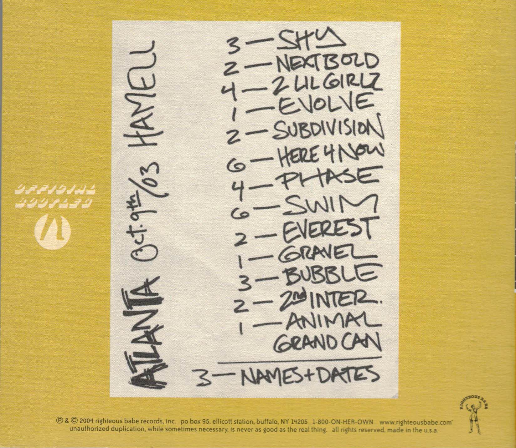 The first release in a series of official bootlegs. Thanks to a state-of-the-art recording studio that Ani takes on tour, her October 9, 2003 Atlanta performance has been captured in pristine fashion. Only available on the web and at Ani's shows.