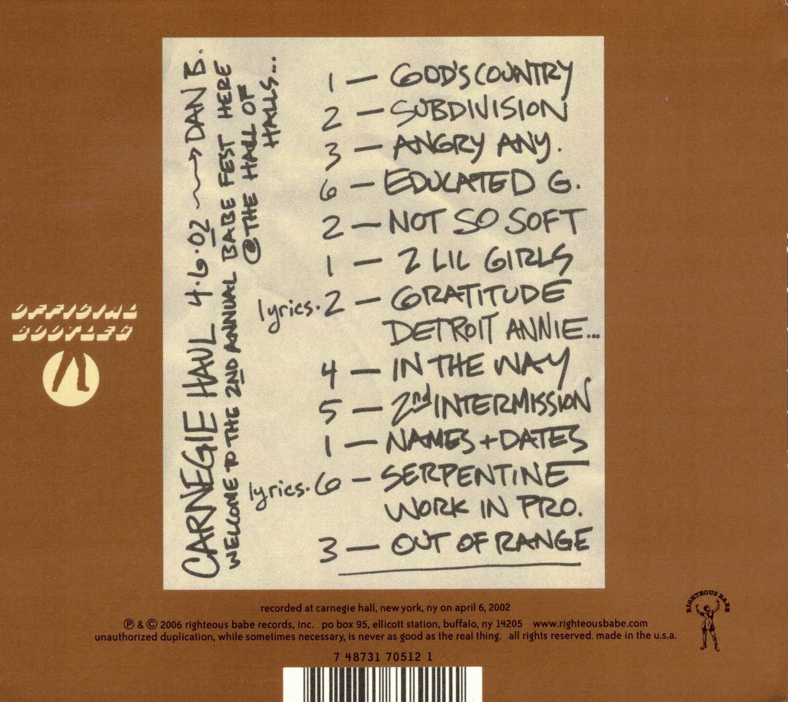 Carnegie Hall 4.6.02 is a great record, and while we're not planning on setting a precedent, it will be first of the Official Bootleg Series to be available in stores. To showcase the unique nature of this show, we also dressed Carnegie Hall 4.6.02 in shiny copper packaging, with sketches and liner notes from the Little Folksinger herself, and included a pull out mini-poster with the lyrics to "serpentine" and "self evident."
